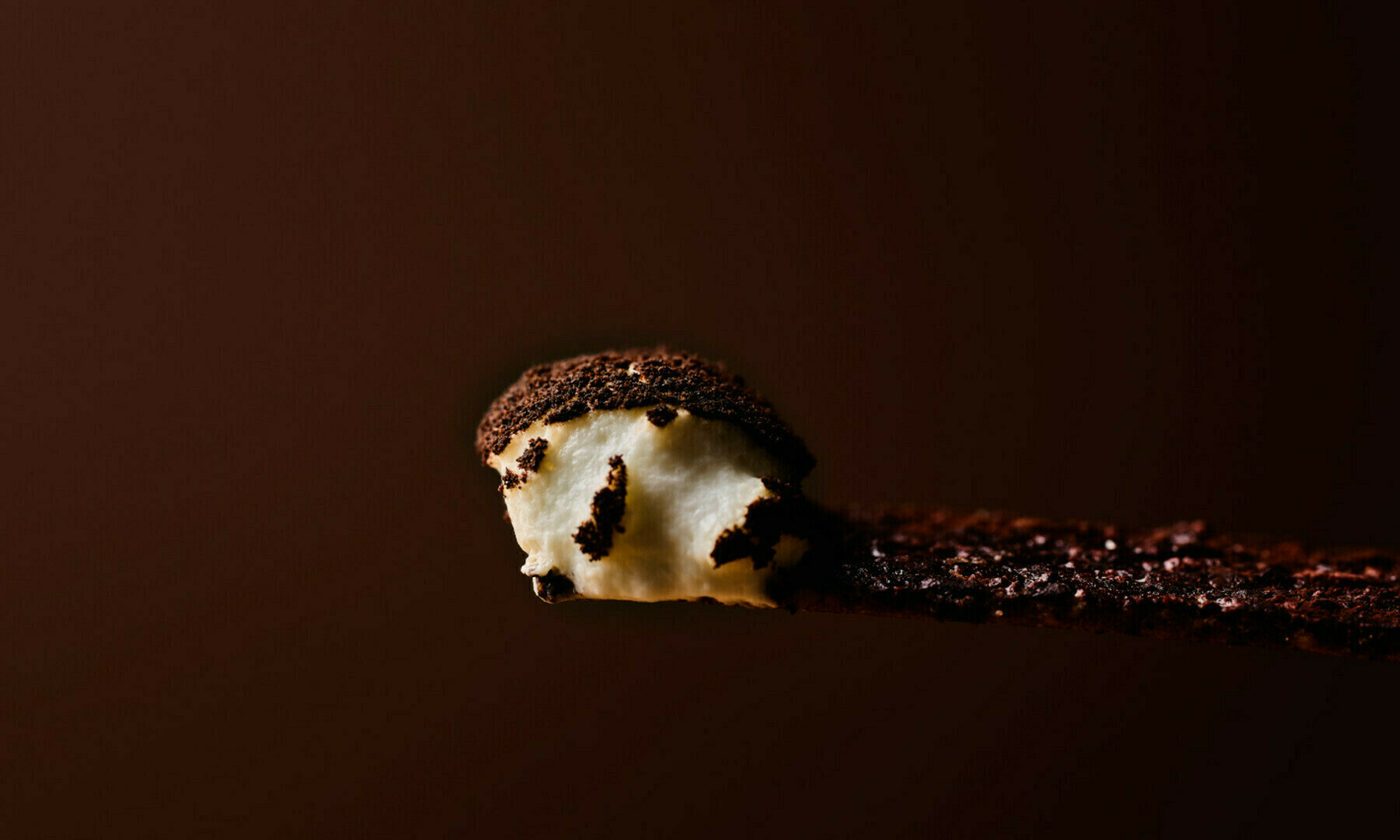 ほろ苦く、甘いひととき クリームにチュイルをディップする、まったく新しいティラミスとの出会い。濃密なクリームとチュイルを重ね、ほろ苦さとただよう甘さ、さまざまな表情を見せるティラミスとの逢瀬を、いま。