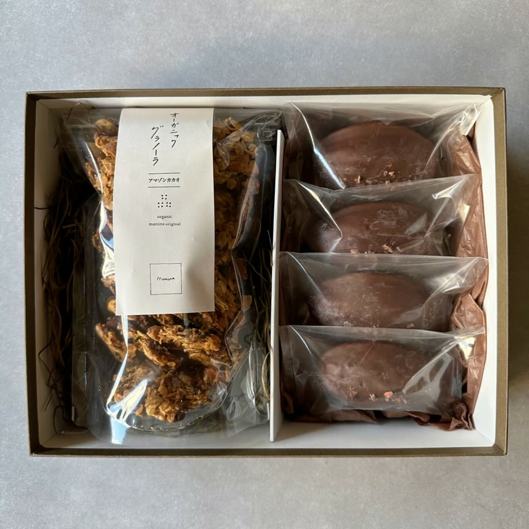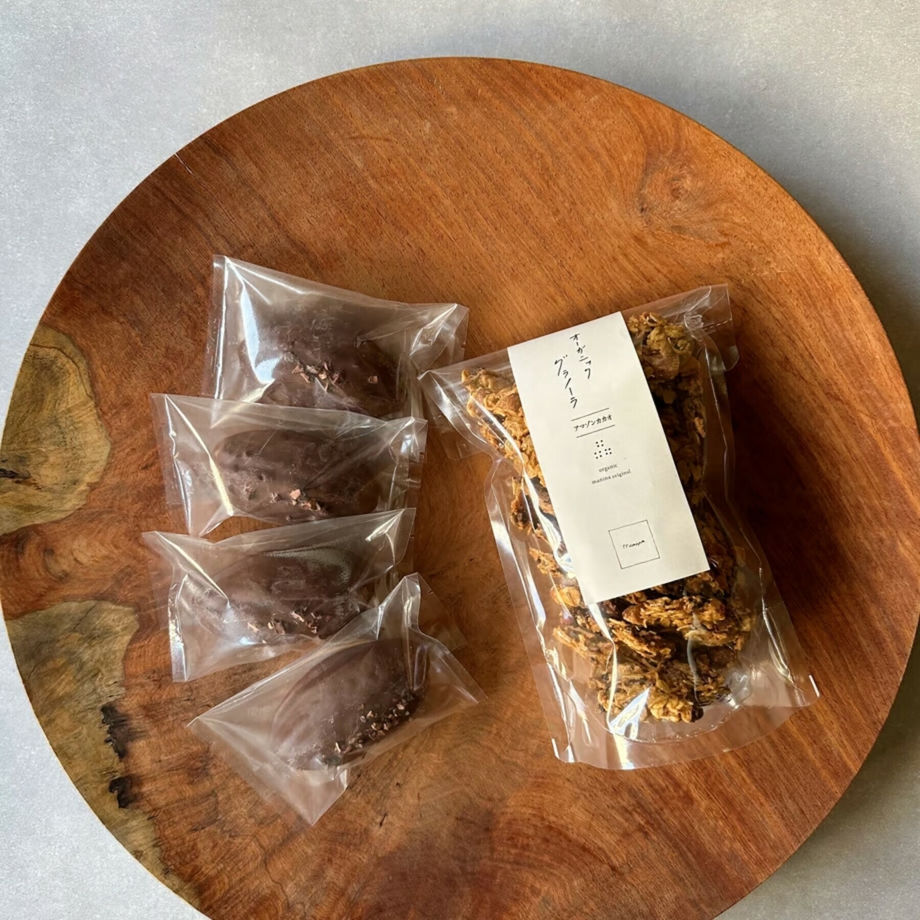 カカオのニブの入ったグラノーラとアマゾンカカオケーキ4個のセットです。