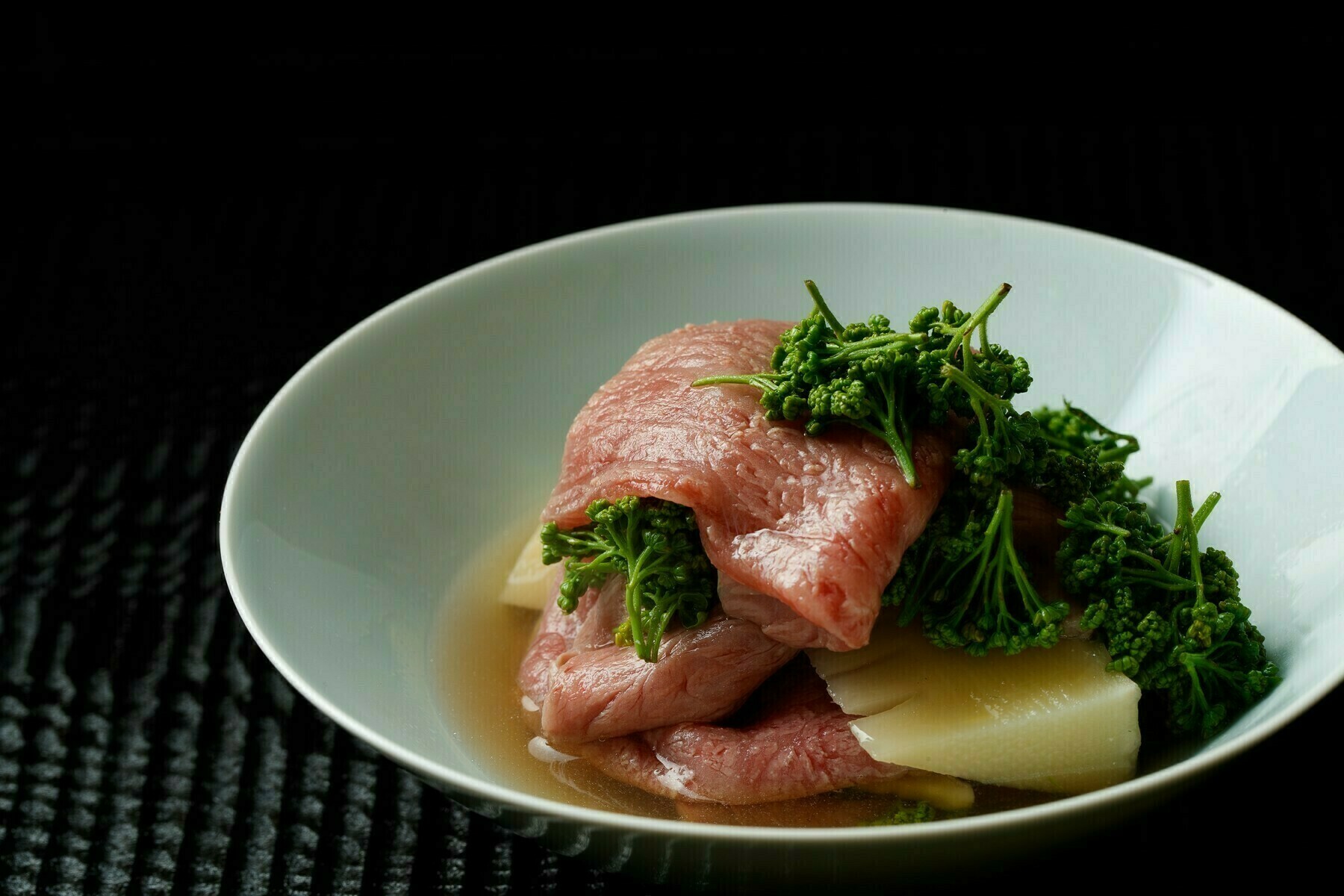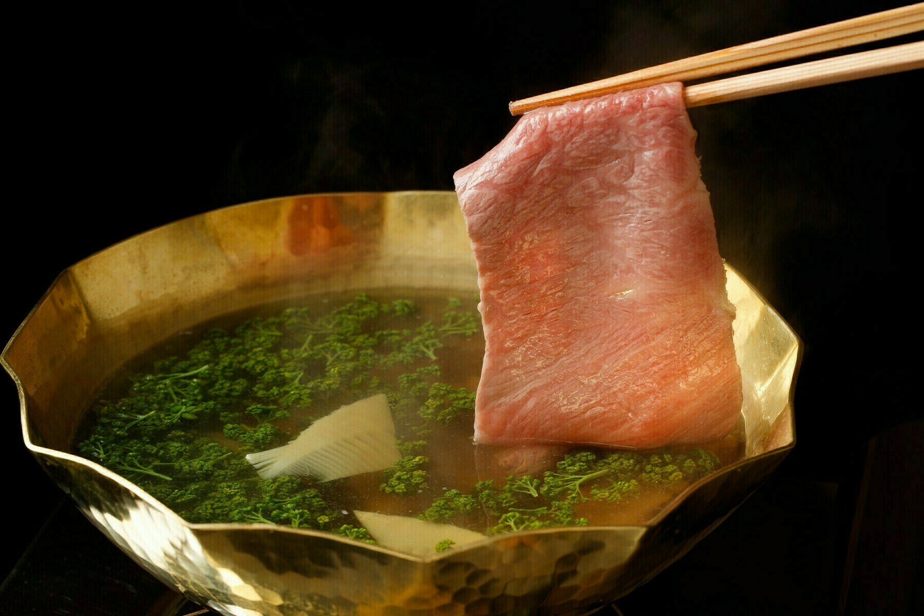 極上の神戸牛・但馬玄(たじまぐろ)、京都塚原産の筍、摘み立ての花山椒を使ったしゃぶしゃぶ鍋です。