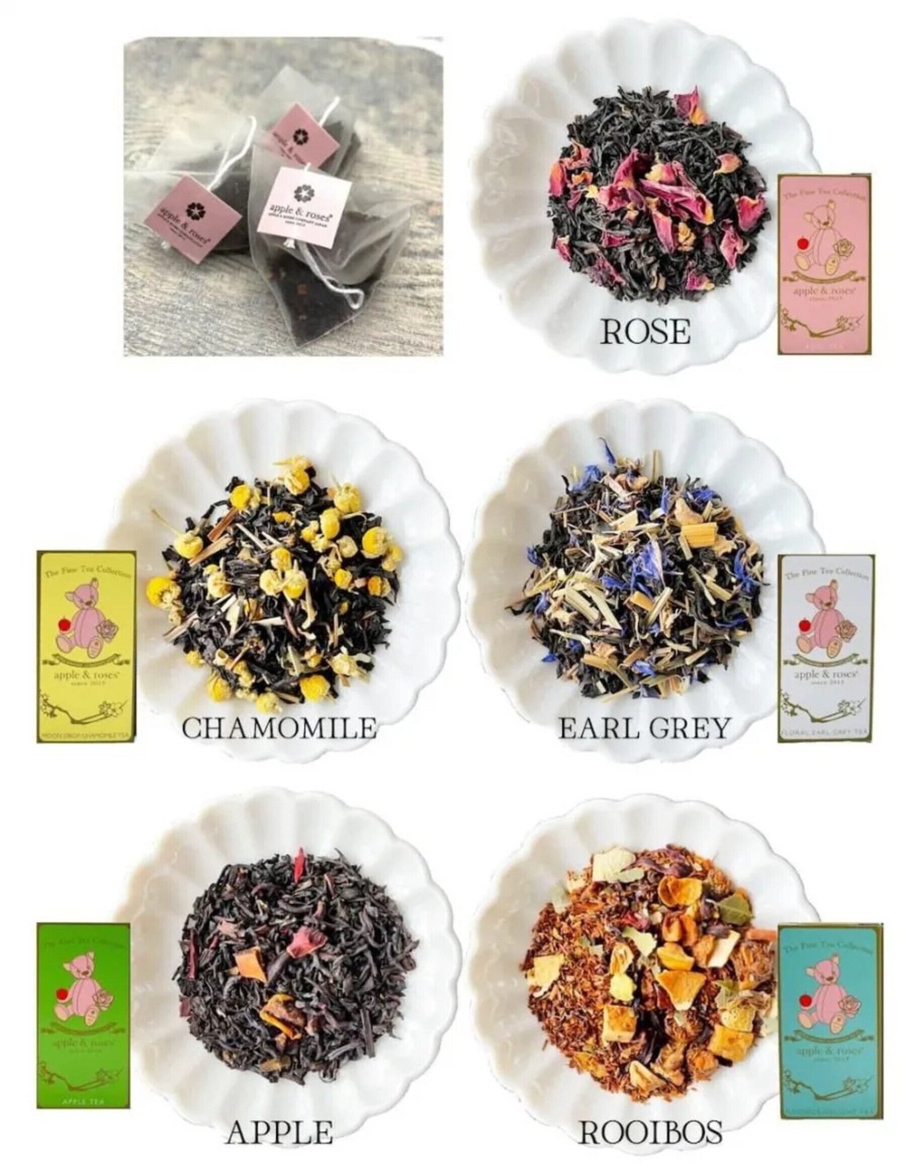 | 原材料 | 【アップルティー】 セイロン茶葉、乾燥りんご、ハイビスカス / 香料(一部にりんごを含む) 【ローズティー】 セイロン茶葉、ローズペタル 【フローラルアールグレイ】 セイロン茶葉、レモングラス、ジンジャー、コーンフラワー / 香料 【ムーンドロップカモミールティー】 セイロン茶葉、カモミール、レモングラス / 香料 【ルイボスデライトティー】 セイロン茶葉、ハイビスカス、オレンジピール、朝鮮人参、ローズヒップ、ドライアップル、ライムの葉(一部にりんご、オレンジを含む) |