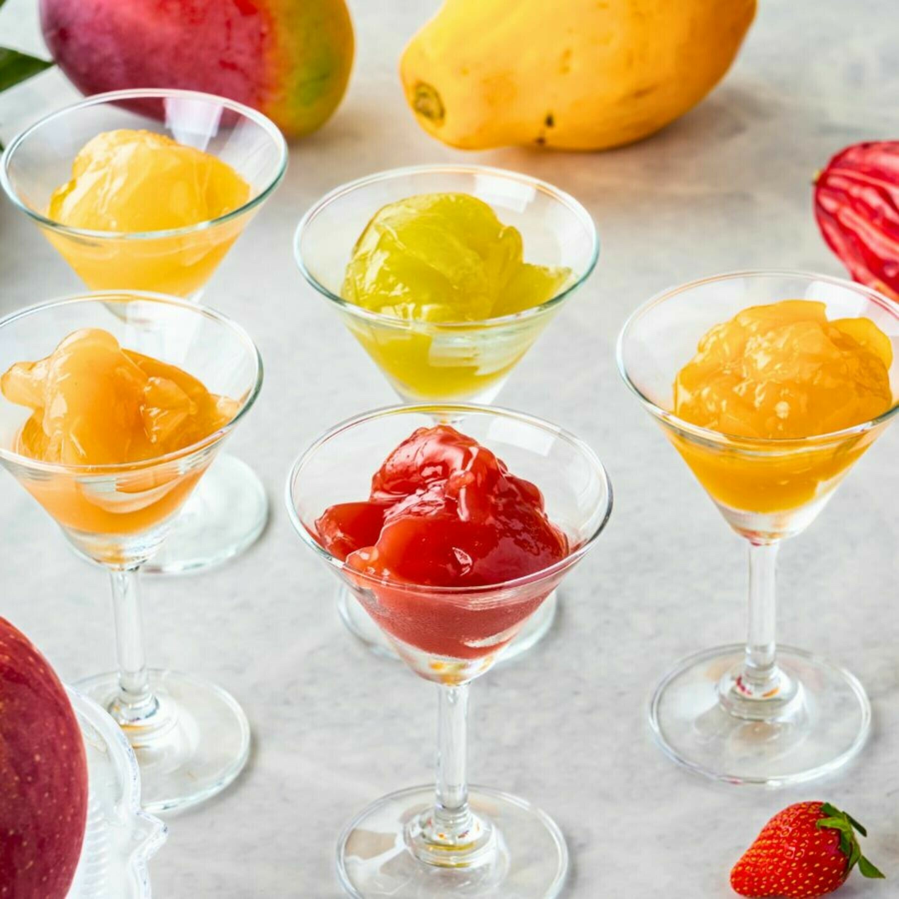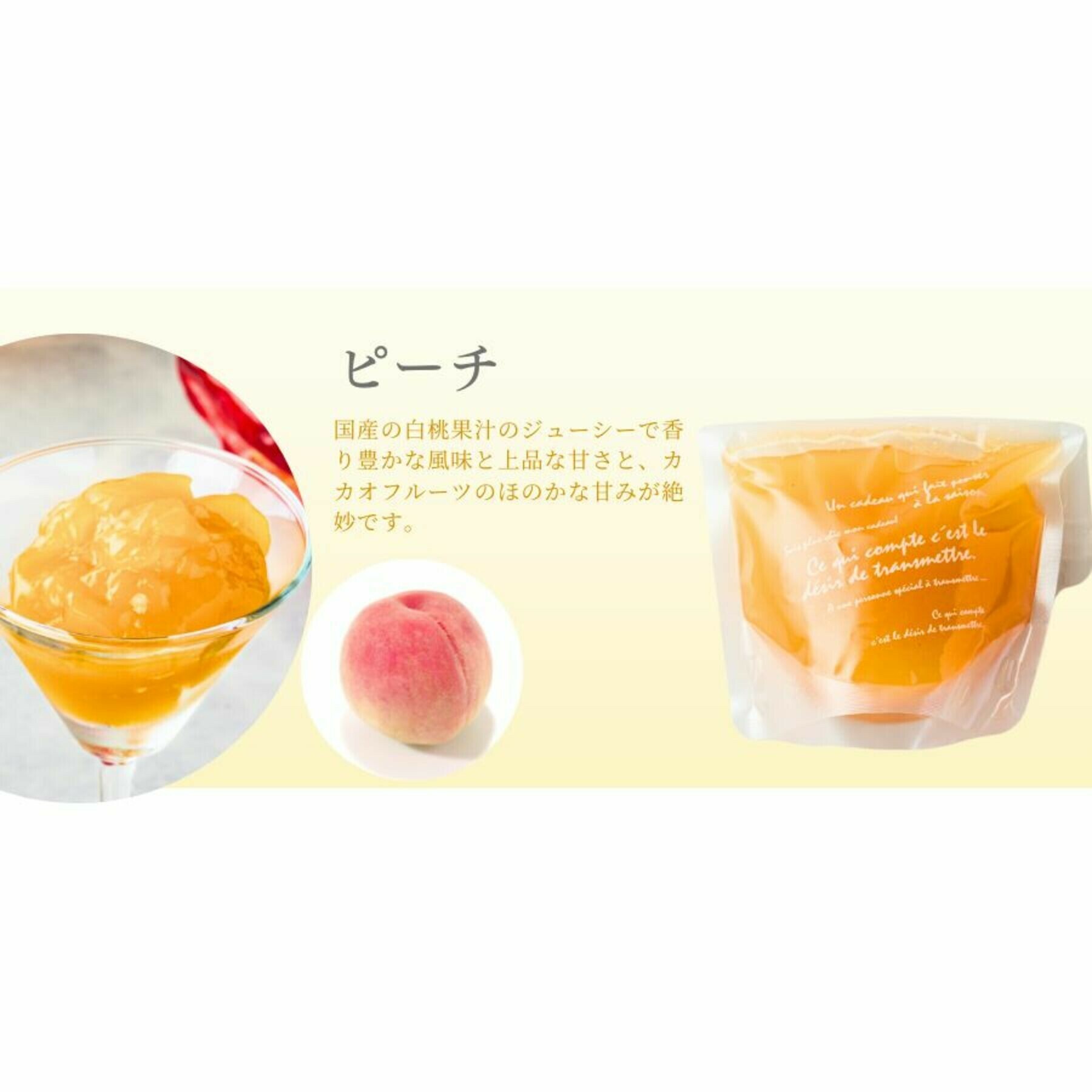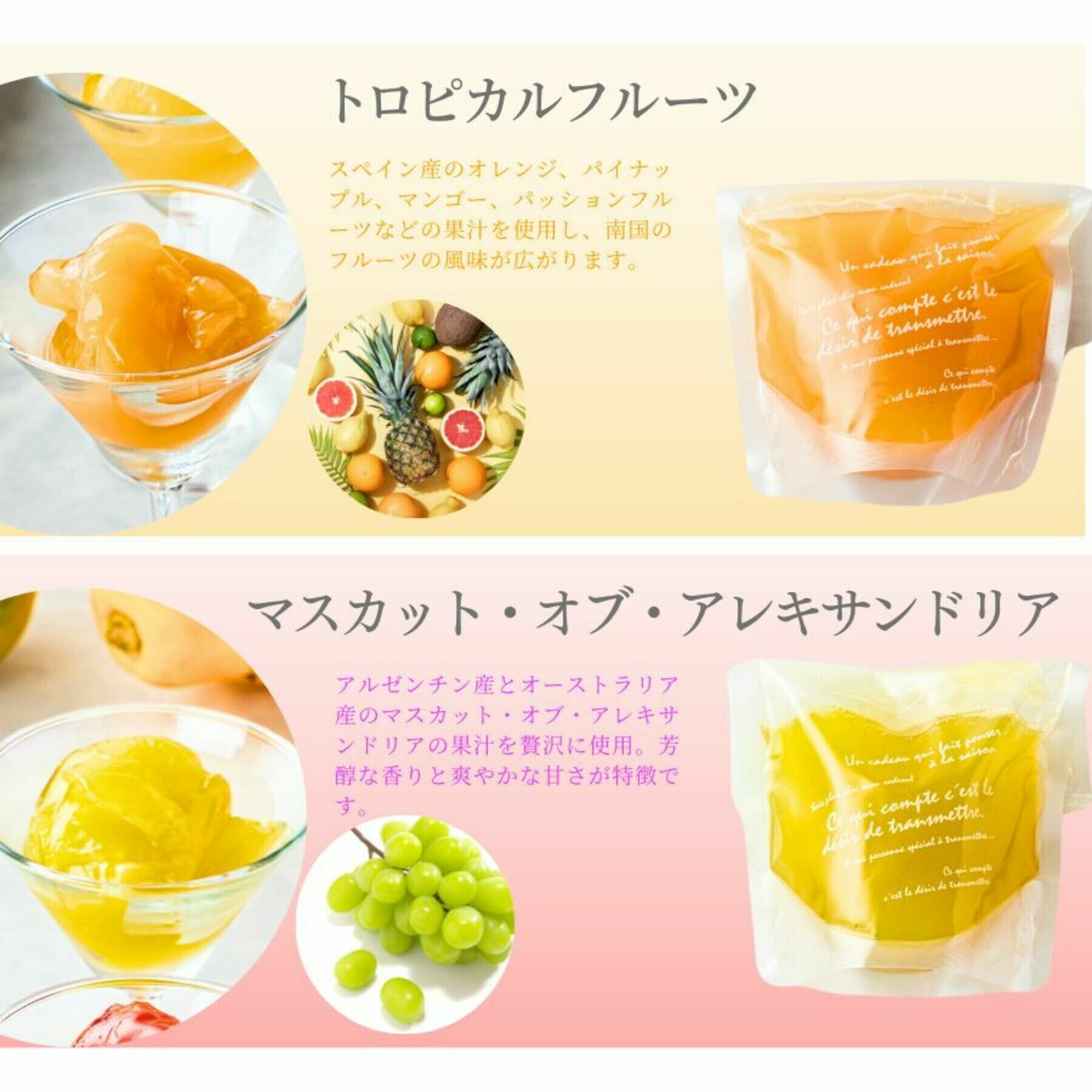 | 原材料 | ・トロピカル:カカオパルプ、オレンジ、マンゴー、パイナップル、パッションフルーツ、ライム、キウイフルーツ、ぶどう、グラニュー糖、ゲル化剤 ・マスカット:カカオパルプ、マスカット、グラニュー糖、香料、ゲル化剤 ・林檎:カカオパルプ、リンゴ、グラニュー糖、香料、ゲル化剤 ・ミックスベリー:カカオパルプ、苺、ラズベリー、ぶどう、ブラックベリー、チェリー、砂糖、ゲル化剤 ・ピーチ:カカオパルプ、桃、グラニュー糖、ゲル化剤、香料 |