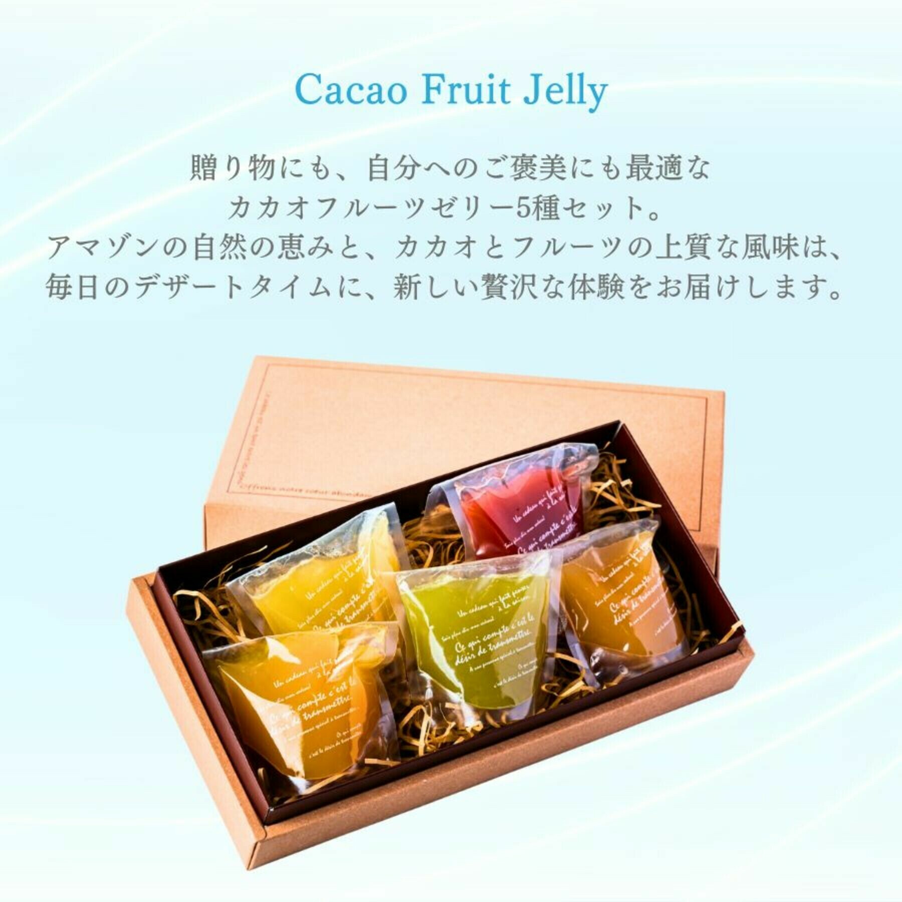 アマゾンの秘宝、カカオフルーツの果肉をふんだんに使用したゼリーセットです。フルーティーでエレガントな風味とさっぱりとした甘み、爽やかな酸味が絶妙に調和し、贅沢なひとときを提供します。