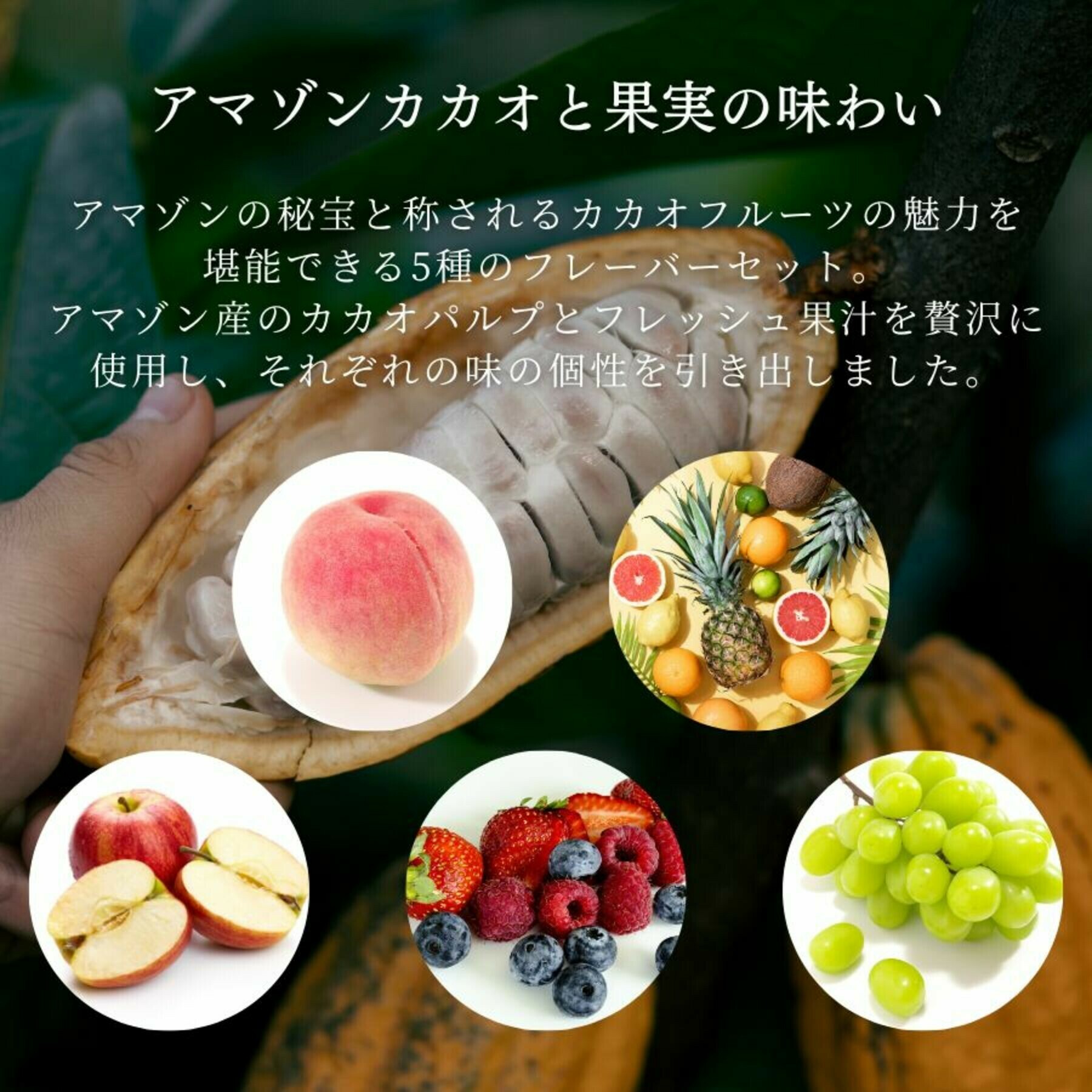 アマゾンの秘宝と称されるカカオフルーツの魅力を堪能できる5種のフレーバーセット。アマゾン産のカカオパルプとフレッシュ果汁を贅沢に使用し、それぞれの味の個性を引き出しました。