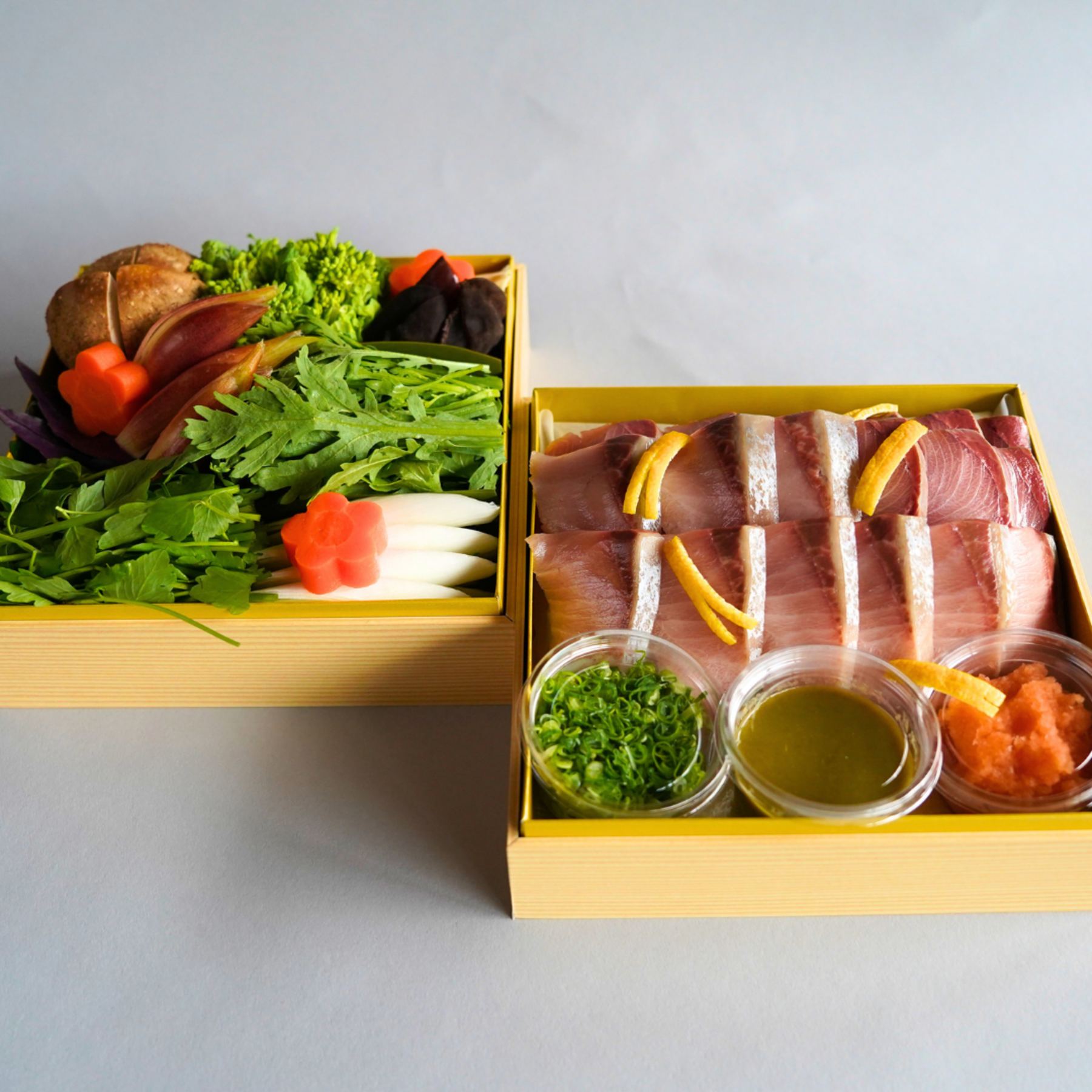 | 原材料 | ・能登寒ぶり ・蕪 ・椎茸、湯葉、菜種、金時草、金沢春菊、白葱、木耳、芹、茗荷、人参、黄柚子 ・もみじおろし、葱、柚子胡椒 ・ぽん酢 ・出汁(約1リットル) |