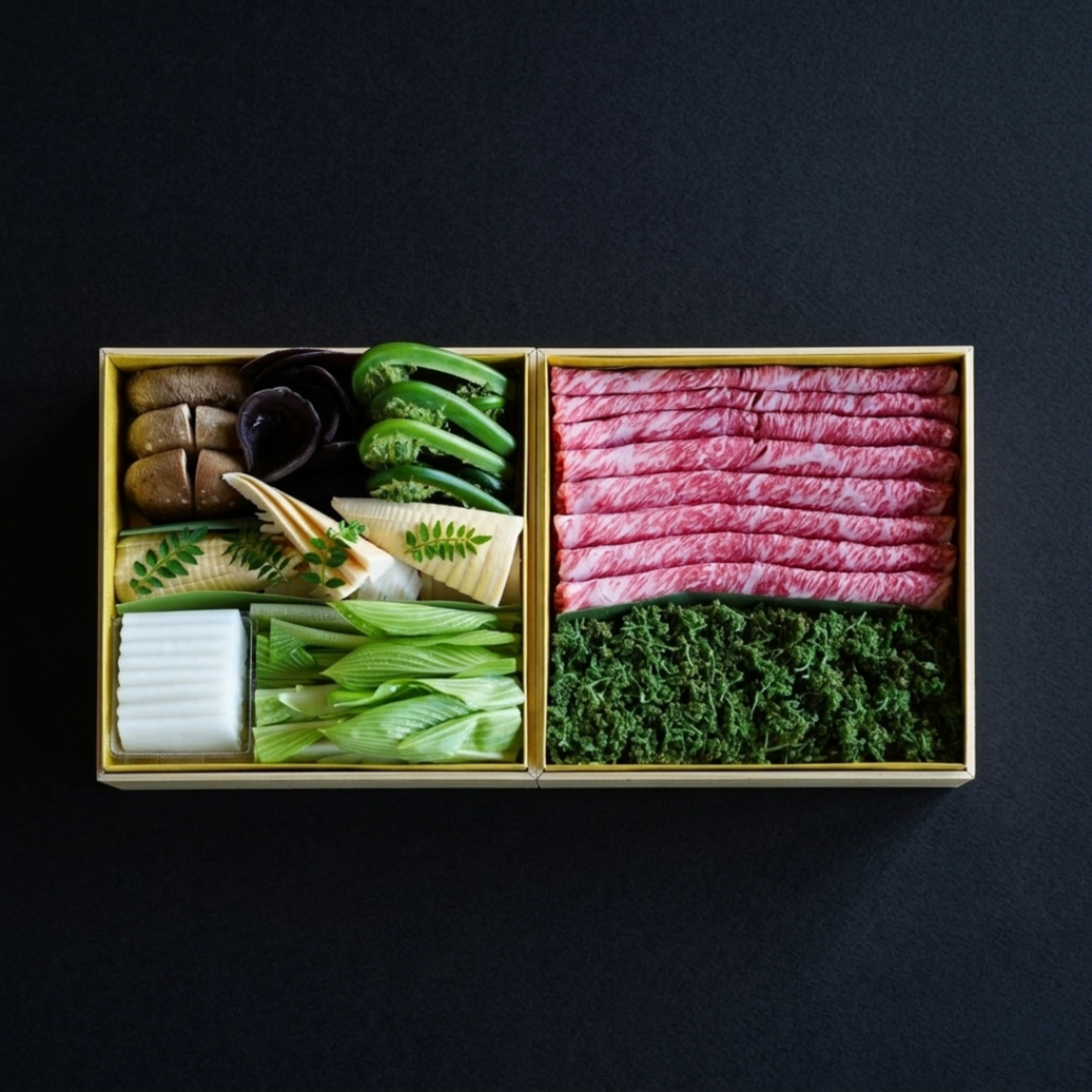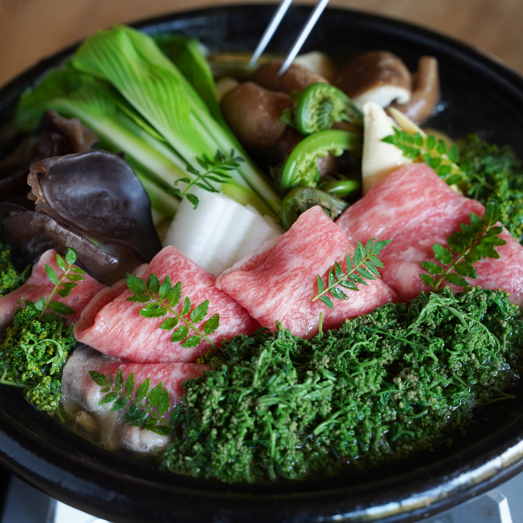 | 原材料 | 能登牛 花山椒 筍、しいたけ、木耳、こごみ、木の芽、うるい 料理長特製お出汁 |