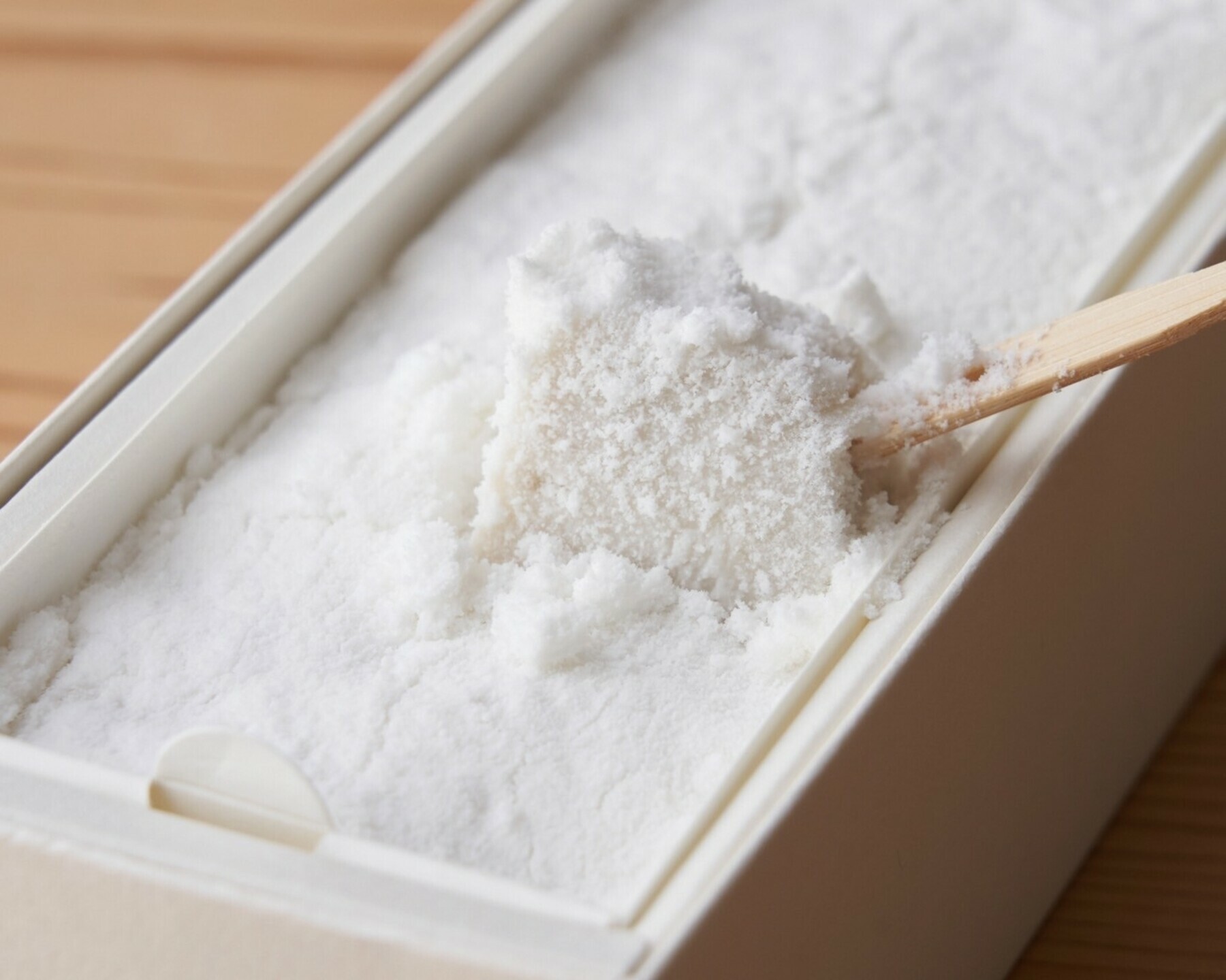 お召し上がりの直前に袋詰めされたさらさらなパウダーを振りかけて、たっぷりまぶしてお召し上がりいただくことでココナッツの芳醇な香りともっちりとした食感を、さらにより一層お楽しみいただけます。