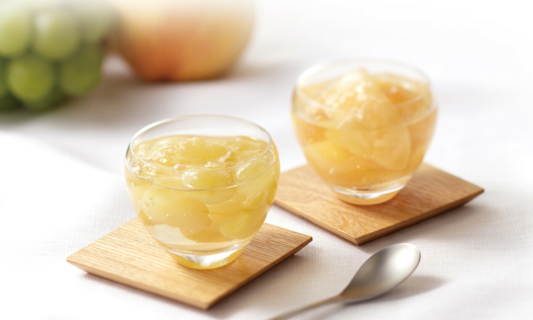 白桃のとろけるような果汁をジェリーに仕込み、たっぷりとビンに詰めました。ホワイトブランデーとピーチリキュールをほどよくブレンドし、クラッシュ感のあるジェリーにしました。