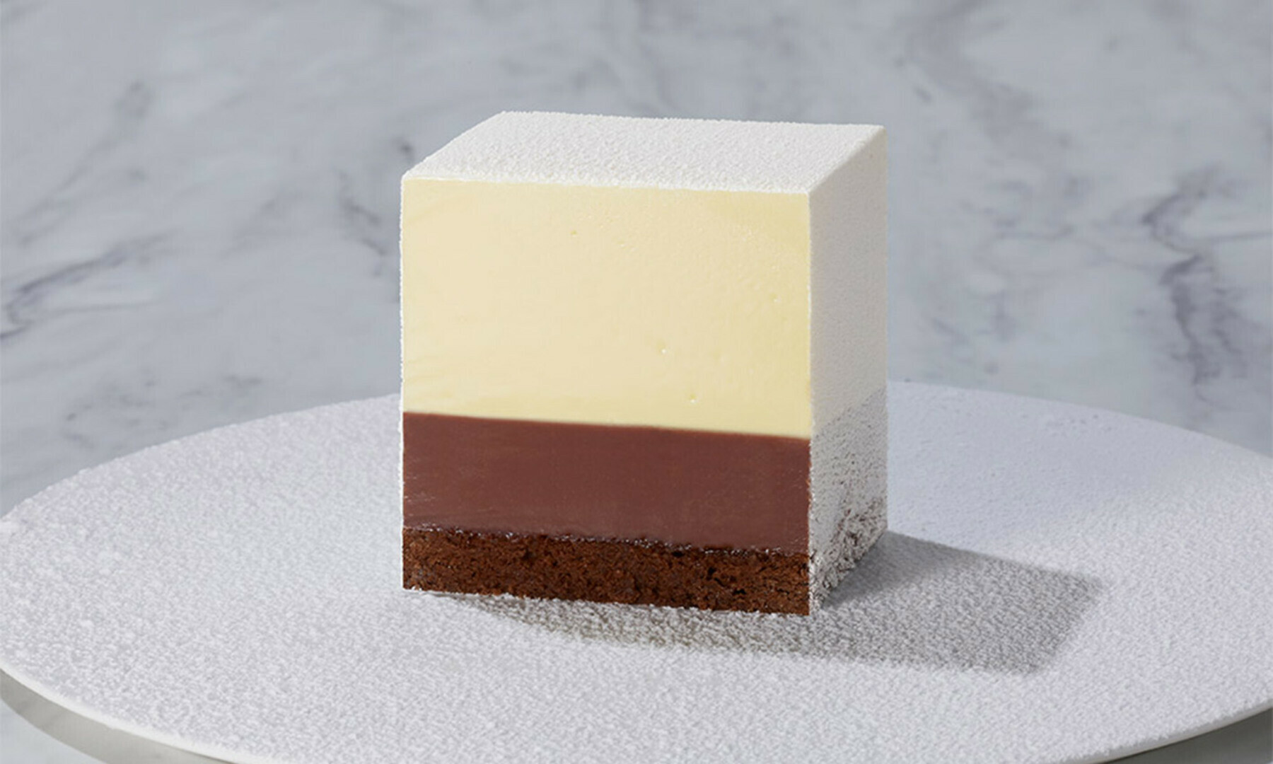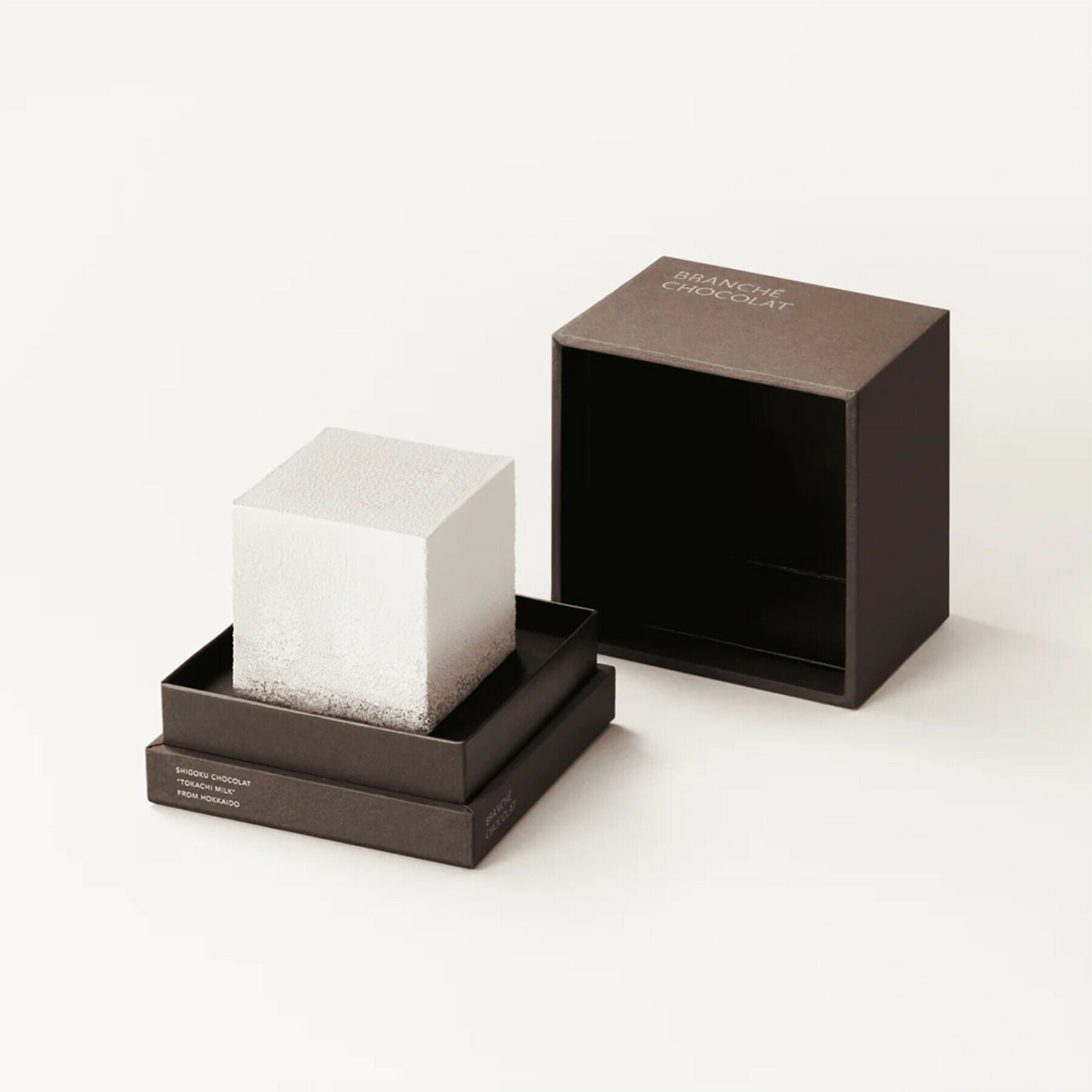 牛乳本来の風味を大切にしたホワイトガナッシュとミルクチョコレート、しっとりと仕上げたブラウニーが、緻密に計算された比率で層を成し、誰がカットしても、どこをカットしても美しい断面が現われます。