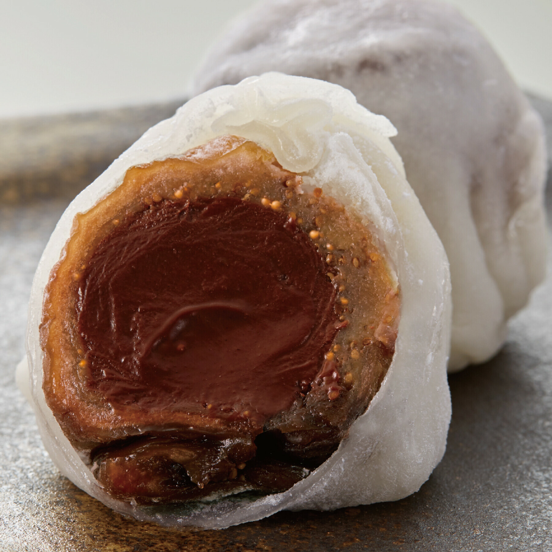 国産無花果をほんの少しだけ乾燥させ、その中にシルキーな舌触りの生チョコを閉じ込め、求肥で包みました。