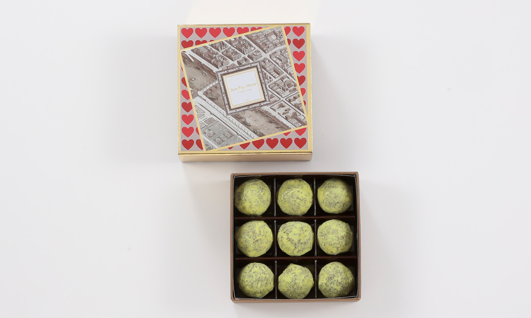 洋梨とアーモンドのガナッシュをビターチョコレートでコーティングした「トリュフ ポワール アマンド」を9個詰合せ。