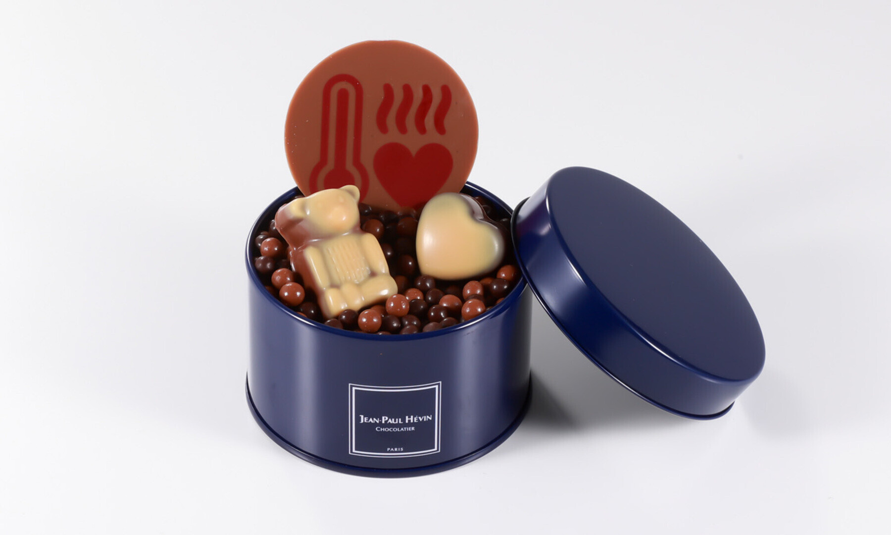 ハートのデザインを施したパレと、クマの形のショコラ、ハートのショコラとペルルクラッカントゥをブルーの缶に詰合せ。