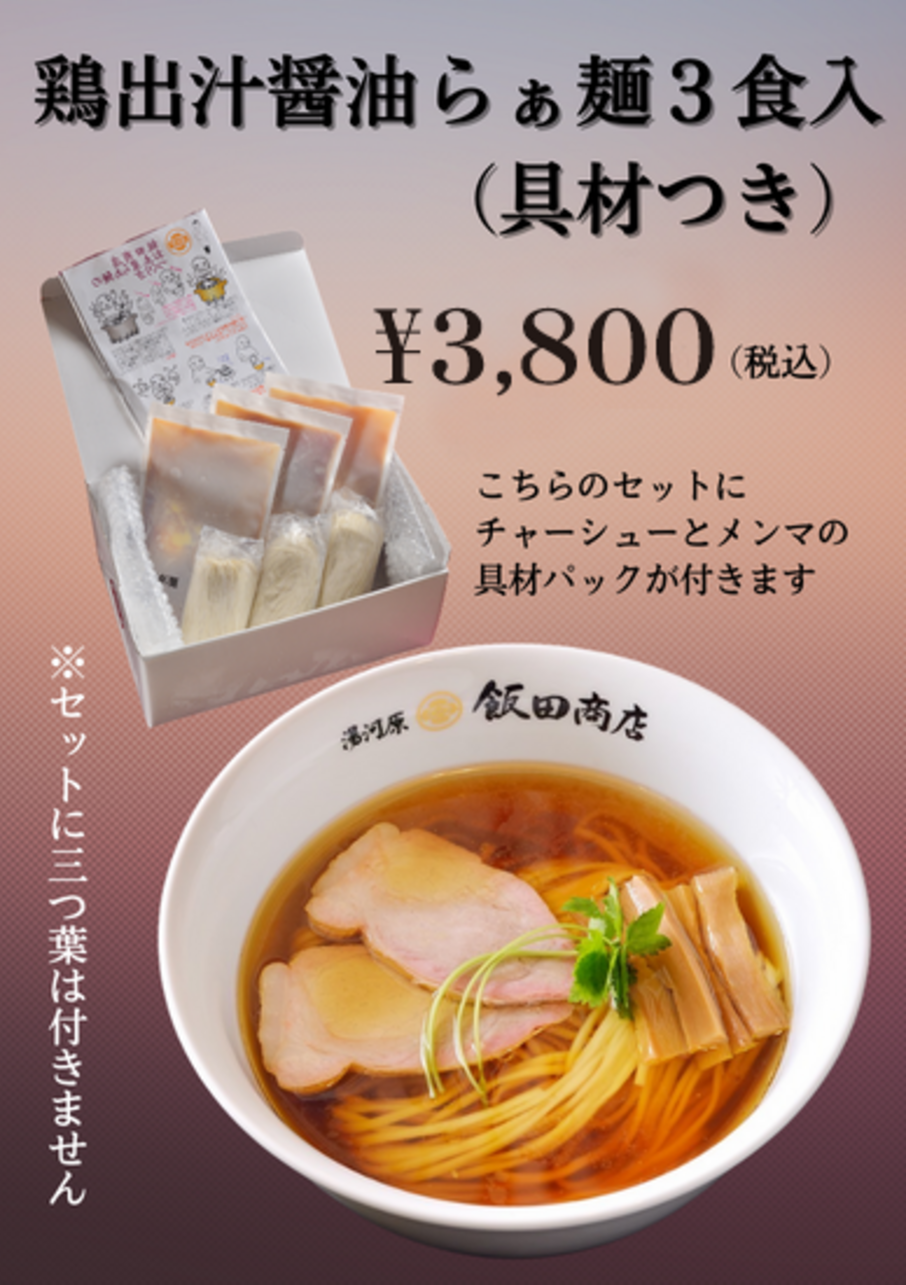 | 原材料 | ・スープ…鶏肉、鶏ガラ(国産)、鶏油、醤油、昆布、みりん、りんご酢 ・麺…小麦粉(国産小麦)、塩 ・チャーシュー…豚肉(国産)、醤油 ・メンマ…麻竹、和風出汁(昆布、サバ節、煮干し、かつお節、マッシュルーム)、醤油、みりん、砂糖 ・かんすい、打ち粉(酸化デンプン) ※麻竹、かんすい以外は全て国産 |
