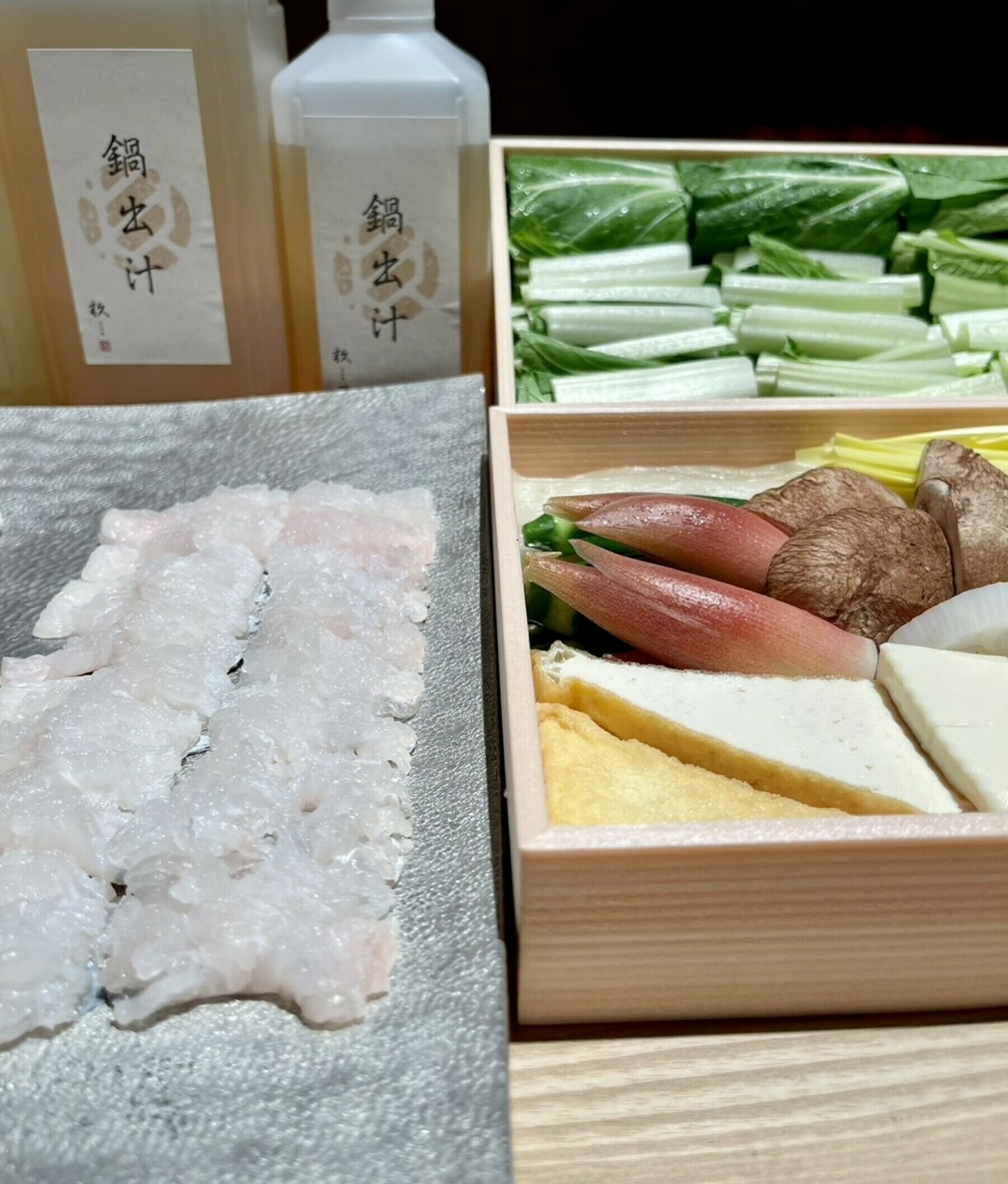 | 内容量 | 2~3人前 ※鍋出汁1.5リットル、白出汁500ml、特製ポン酢180cc、淡路鱧700gサイズ一本分約300g、稲庭うどん200g |