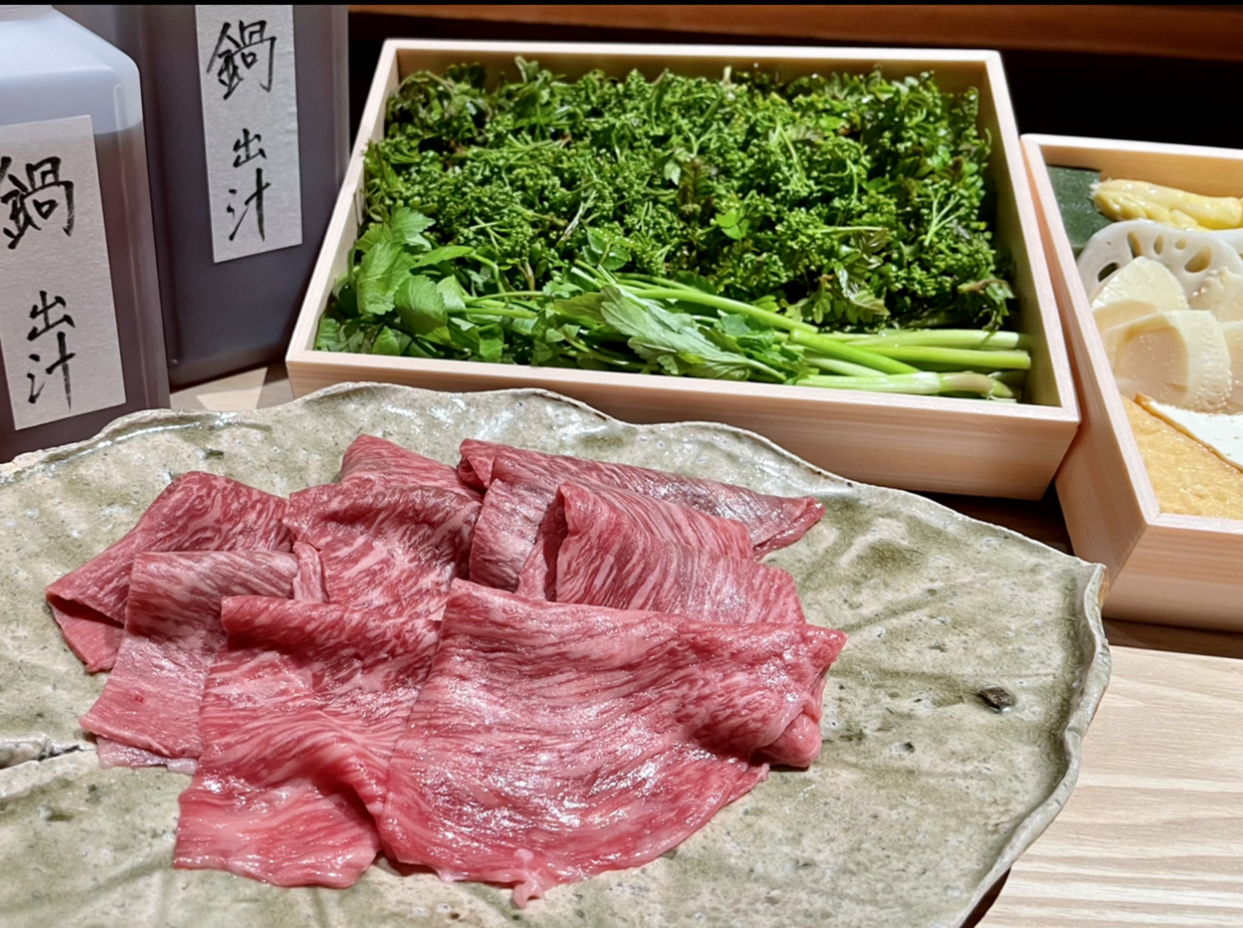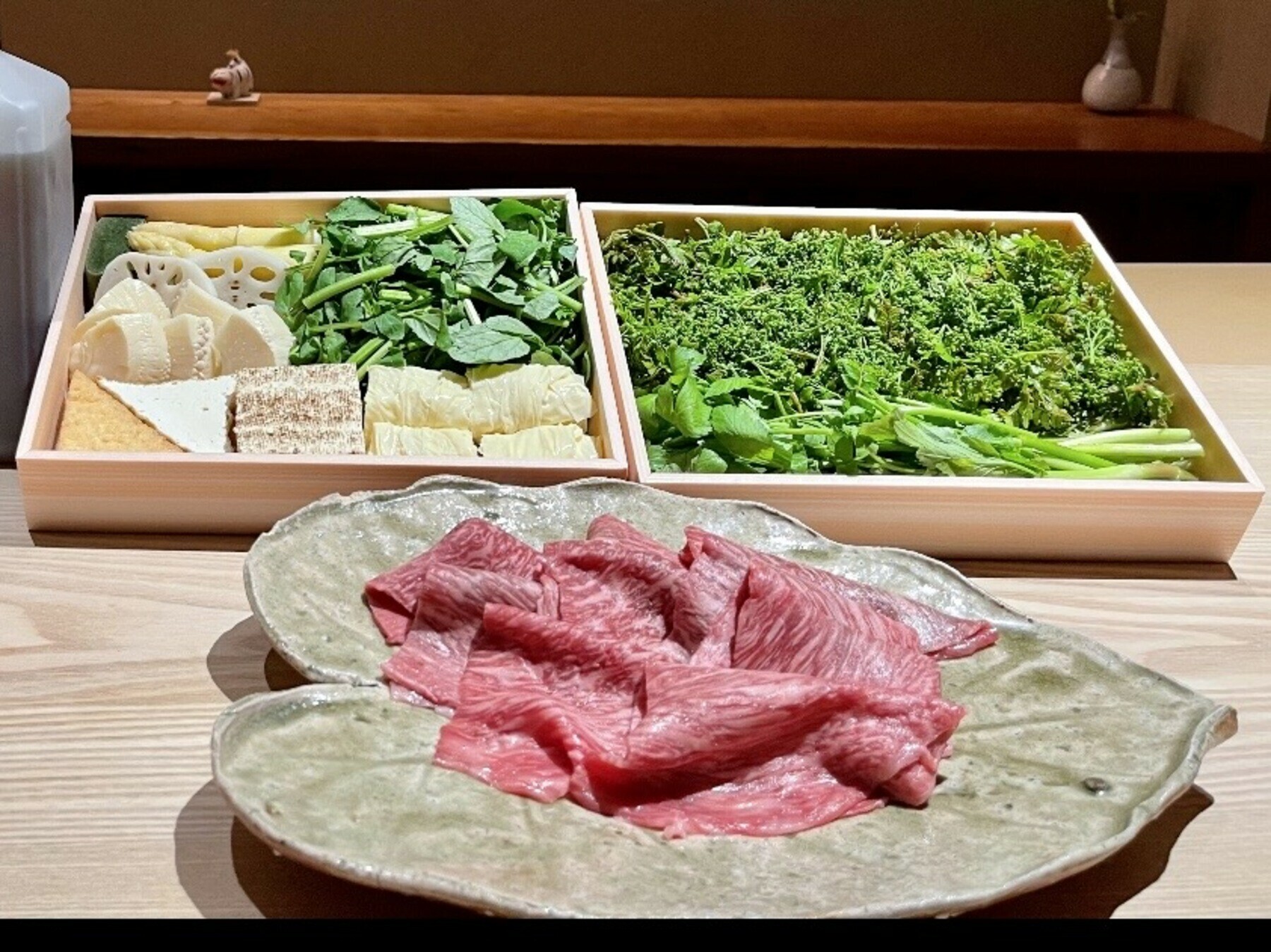| 原材料 | 鍋出汁1.5リットル、白出汁1リットル、 牛肉300g、花山椒と路地木の芽100g、 筍、白アスパラ、蓮根、芹、クレソン、生麩、生湯葉、焼き豆腐 |