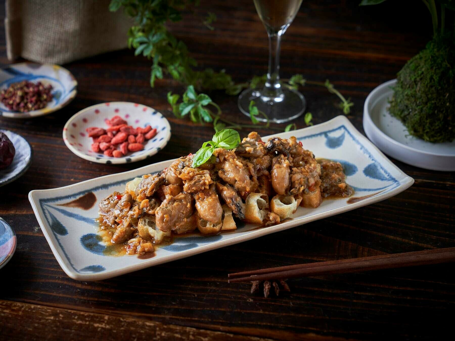 「フージンツリー」監修の牡蠣と揚げパンのニンニクソース。広島産ベビーオイスターを、ニンニクの利いた自家製オイスターソースで仕上げました。
