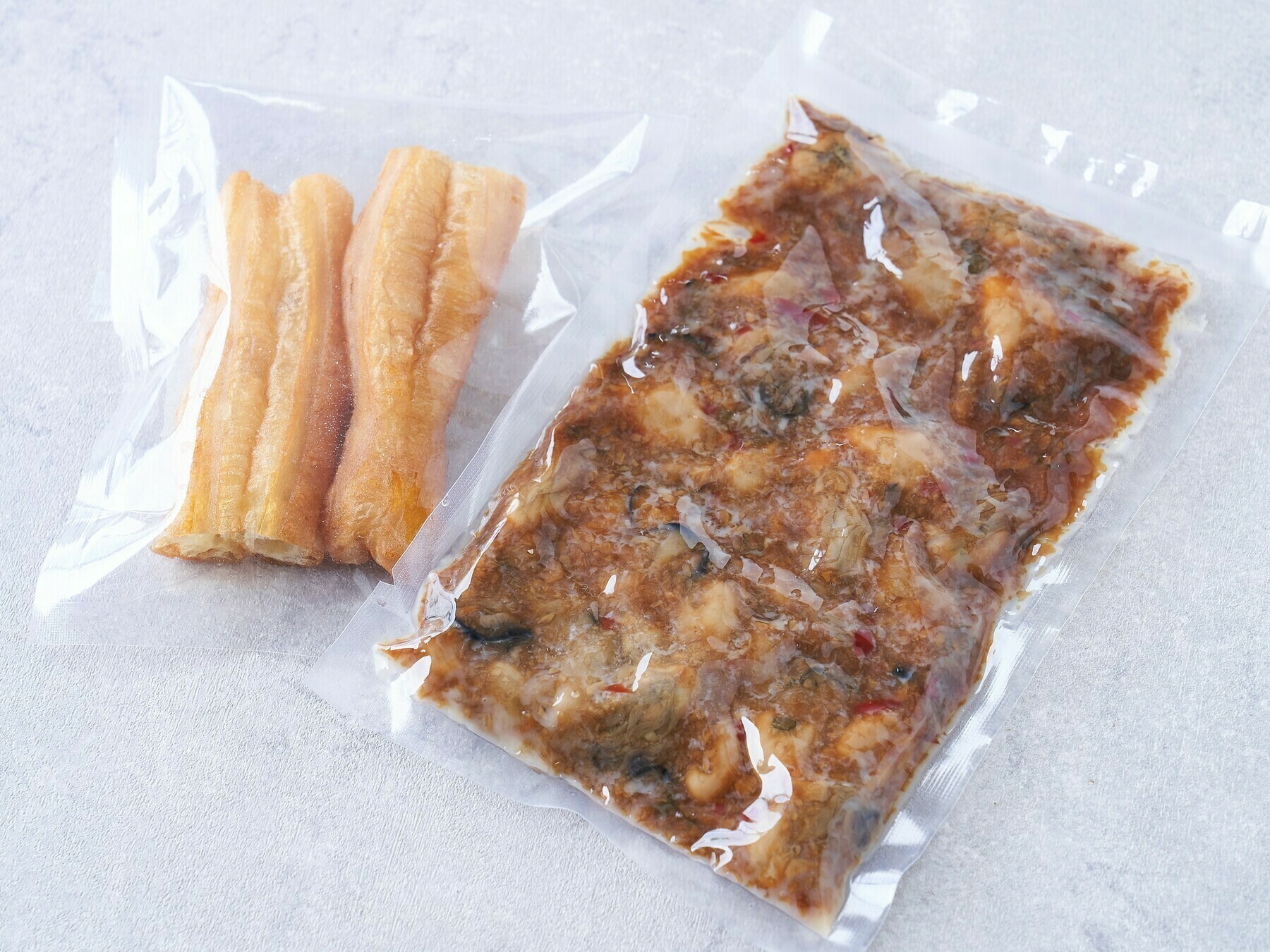 ②「牡蠣のニンニクソース」は、大き目の鍋にお湯を沸騰させ、商品を真空パックのまま、お湯に浸るように入れ、温めて(中火で5~7分)ください。