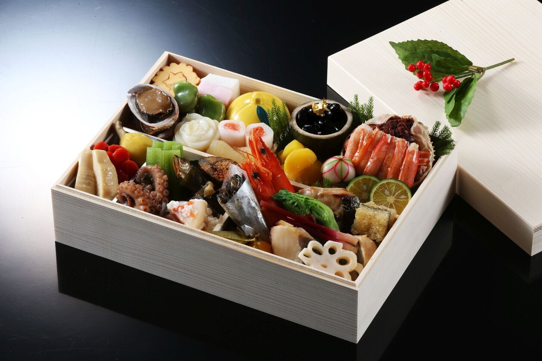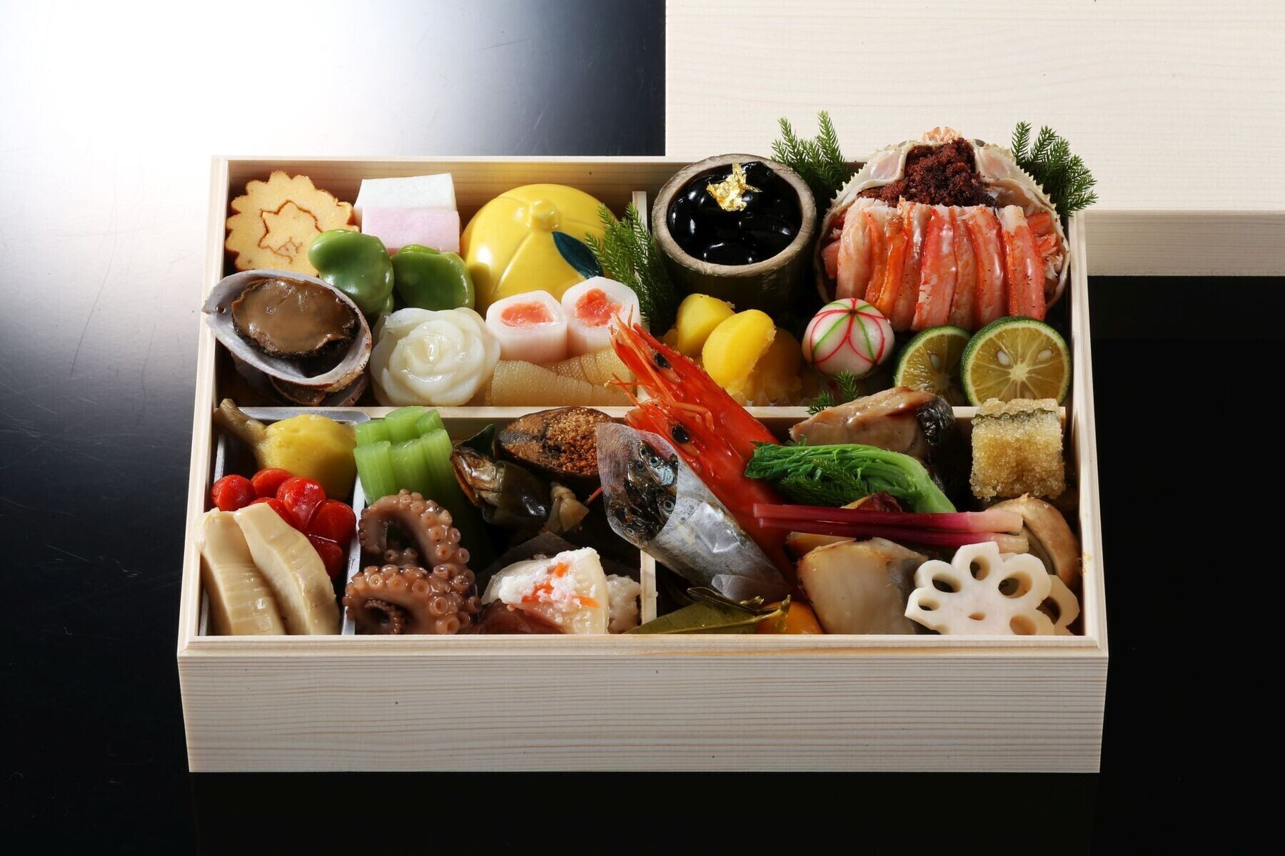 | 原材料 | 背子蟹面詰め(ズワイガニ雌(国産)、米酢、砂糖)、海老艶煮(ブラックタイガー、醤油、 塩、砂糖)、鰤のかぶら寿司(鰤、あお蕪、人参、 唐辛子、漬け原料(米、糀、食塩))、穂付筍(筍、醤油、食塩、砂糖、鰹節エキス)、数の子(数の子、水飴)、伊達巻(鶏卵、 魚肉すり身、澱粉)、鰤西京焼(鰤、西京味噌、米、大豆、酒精)、鰆柚庵焼(さわら、柚子、醤油、塩、砂糖)、 蕗含め煮(蕗、発酵調味料、鰹節エキス、醤油、食塩)、黒豆(黒豆、水飴)、子持ち昆布(子持ち昆布、水飴、魚介エキス、たん白加水分解物)、花百合根、小鮑艶煮(あわび、醤油、塩、砂糖)、サーモン奉書巻(大根、鮭、米酢、食塩、砂糖)、穴子鳴門巻(穴子、生姜)、くわい六方(くわい、鰹節、醤油、食塩、 砂糖)、小鮎昆布巻き(鮎、昆布、干瓢、寒天)、鮎甘露煮(鮎、水飴、醤油、塩)、紅白蒲鉾(ハモ、白口、いとより)、栗きんとん(さつまいも、栗、白生餡)、いくら柚子釜(柚子、いくら、水飴、昆布、たん白加水分解物)、松葉蛸さくら煮(蛸、醤油、発酵調味料、還元水飴、鰹節、昆布エキス、食塩)、叩き牛蒡(牛蒡、ごま、発酵調味料、唐辛子)、梅人参(人参、発酵調 味料、鰹節エキス)、青味大根(大根、西京味噌)、金柑蜜煮(金柑、水飴)、手毬麩(小麦グルテン、餅粉、柚子、白餡)、一寸豆蜜煮(一寸豆、水飴)、葉地神生姜(生姜、米酢)、田作り(片口イワシ、寒天、ごま、たん白加水分解物)、花蓮根(蓮根、唐辛子、米酢、砂糖、たん白加水分解物)、栗甘露煮(栗、水飴)、酢橘 |