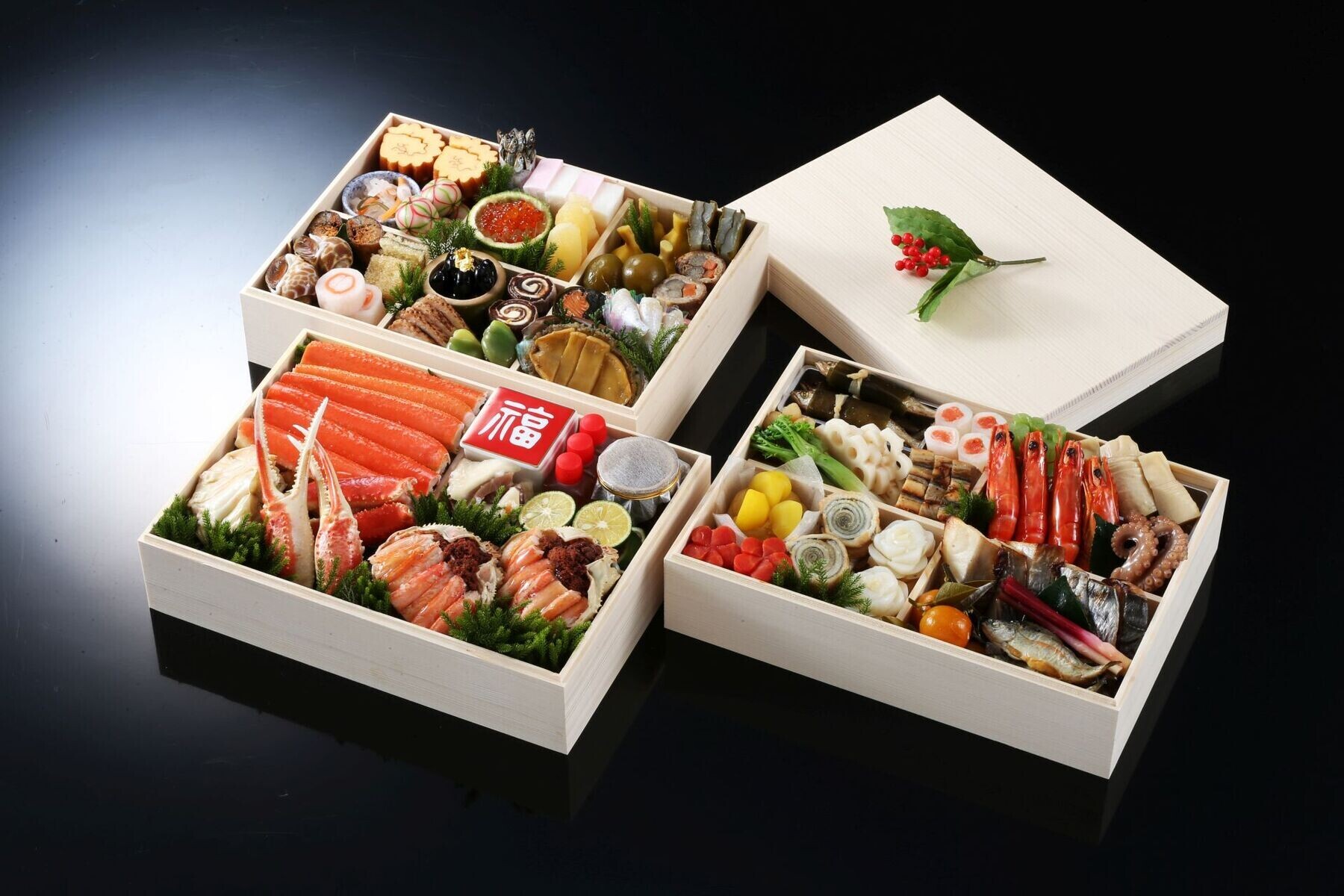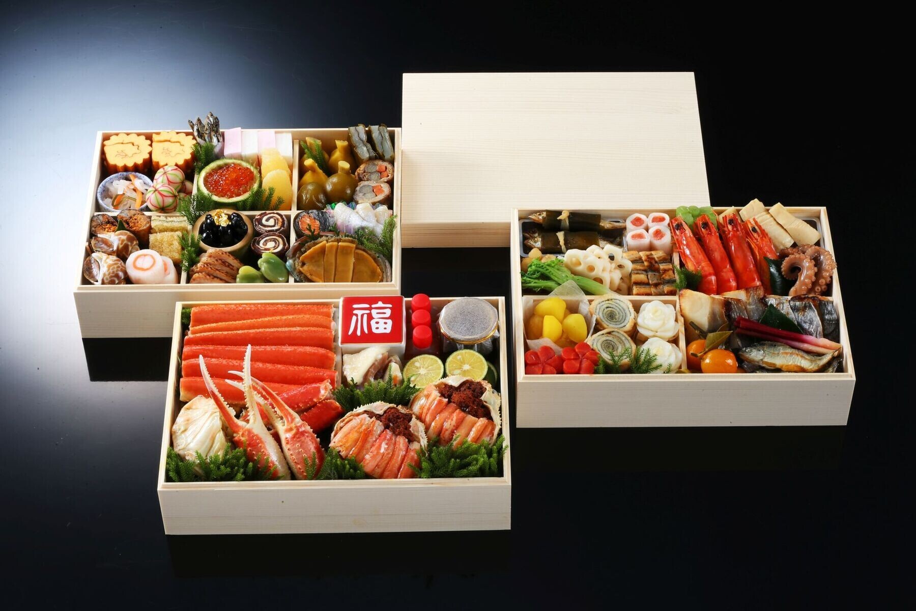 | 原材料 | 松葉蟹(ズワイガニ雄(国産)、米酢、砂糖)、背子蟹(ズワイガニ雌、米酢、砂糖)、梅貝旨煮(梅貝、水飴、醤油、食塩)、伊達巻(鶏卵、魚肉すり身、澱粉)、海老艶煮(ブラックタイガー、醤油、食塩、砂糖)、数の子(数の子、水飴)、鰤西京焼(鰤、西京味噌)、鰆柚庵焼き(鰆、柚子、醤油、食塩、砂糖)、えぞ鮑旨煮(鮑、醤油、食塩、砂糖)、子持ち昆布(子持ち昆布、水飴、魚介エキス)、鰤のかぶら寿司(鰤、あお蕪、人参、唐辛子、漬け原料(米、糀、食塩))、くわい六方(くわい、鰹節、醤油、食塩、砂糖)、花百合根、穴子鳴門巻(穴子、生姜)、鰻真丈(鰻、魚肉すり身、卵白、山芋、澱粉)、小鮎昆布巻き(鮎、昆布、干瓢、寒天)、穂付筍(筍、醤油、食塩、砂糖、鰹節エキス)、天子南蛮漬(あまご、米酢、澱粉、食塩、醤油、砂糖、たん白加水分解物)、鮭昆布巻き(鮭、昆布、醤油、砂糖、水飴)、京甘梅(青梅、果糖ブドウ糖液)、鮎甘露煮(鮎、発酵調味料、鰹節エキス、醤油、塩)、梅人参(人参、発酵調味料、鰹節エキス)、栗きんとん(さつまいも、栗、白生餡)、松葉蛸さくら煮(蛸、醤油、発酵調味料、還元水飴、鰹節、昆布エキス、食塩)、まとう鯛博多押し(まとう鯛、昆布)、牛肉八幡巻(牛肉、牛蒡、人参、卵白、澱粉、チキンエキス、醤油)、蟹紅白巻(大根、かに、人参)、サーモン奉書巻(大根、鮭、米酢、食塩、砂糖)、蕗含め煮(蕗、発酵調味料、鰹節エキス、醤油、食塩、砂糖)、合鴨ロース煮(合鴨、醤油)、紅白なます(大根、人参、ごま、調味液(米酢、砂糖、食塩)、たん白加水分解物)、紅白蒲鉾(ハモ、白口、いとより)、一寸豆蜜煮(一寸豆、水飴)、黒豆(黒豆、水飴)、叩き牛蒡(牛蒡、白胡麻、発酵調味料、唐辛子)、青味大根(大根、西京味噌)、金柑蜜煮(金柑、水飴)、葉地神生姜(生姜、米酢)、小鯛笹漬(鯛、昆布)、手毬麩(小麦グルテン、餅粉、柚子、白餡)、酢橘、いくら柚子釜(柚子、いくら、水飴、昆布エキス)、蟹山椒(紅ズワイガニ、みりん、山椒の実(朝倉山椒)、小麦醸造調味料(小麦、食塩、焼酎)、食塩)、柿鳴門(干し柿、発酵バター、宿曜製粉加工油脂、食用植物油脂、乳加工品、卵黄油、食塩、乳成分)、花蓮根(蓮根、唐辛子、たん白加水分解物)、田作り(片口イワシ、寒天、ごま、たん白加水分解物) |